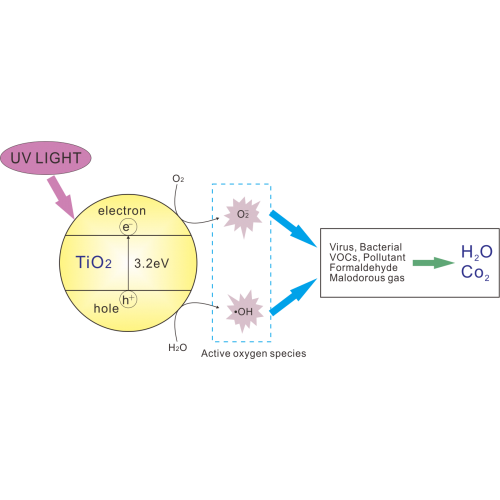 將納米級二氧化鈦 TiO2 移殖到鋁合金過濾網 當紫外光照射到二氧化鈦 表面, 經物理作用產生超強氧化作用, 殺滅流經空氣中細菌及病毒, 淨化空氣中有機氣體 符合 BS476-PART4 標準 風阻低 壽命可長達 10 年